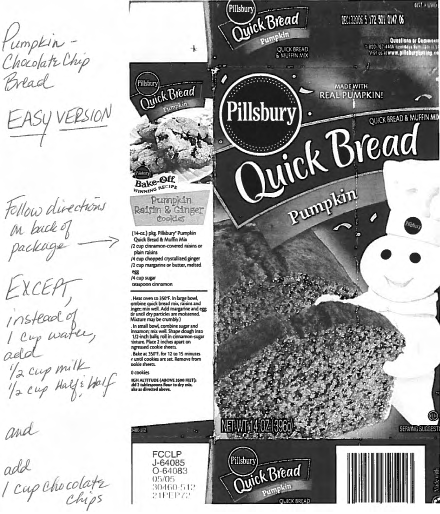 I feel I must be honest: in our test-kitchen zeal—and in our willingness to assemble foods rather than cook them—Kate and I gave box baking a go. We sampled boxed banana bread, boxed chocolate-chip cookies, and (yes) boxed pumpkin bread. Of all of the labor-intensive and surprisingly easy pumpkin-chocolate bread recipes we put to the test, the most perfect bits of pumpkiny, spicy, chocolatey goodness came from the Pillsbury company, Doughboy and all.
